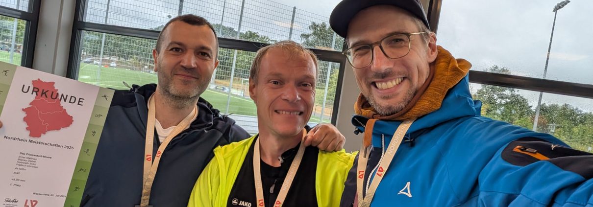 Gegenüber dem letzten Staffellauf der M40er waren diesmal zwei „Neue“ mit dabei. Die Staffel der STG Düsseldorf Moers bestand aus den Moersern Sven Holowarth und Christian Prpitsch und unseren Athleten Daniel Bilaney und Matthias Erber. In den Startblock ging Matthias, der den Stab an Daniel übergab. Nachdem Sven ihn hatte, brachte er ihn rasch zu Chris, der das wichtige Utensil dann letztendlich über die Ziellinie trug. Auch wenn ich mit einer Verbesserung der zulettzt gelaufenen Staffelzeit von 52,26 sec gerechnet hatte, erstaunte die Zeit, bei der die Uhr letztendlich stehen blieb doch mich doch. Chris überlief die Ziellinie nach nur 48,96 sec nach Matthias‘ Start. Dies bedeutete nicht nur den Gewinn der LVN-Meisterschaft und die Bestätigung der Quali für die DM in Gotha, sondern auch den ersten Rang in der aktuellen DLV-Bestenliste. Wenn an den noch etwas wackligen Staffelübergaben geschliffen wird, sehe ich eine weitere Verbesserung für machbar..