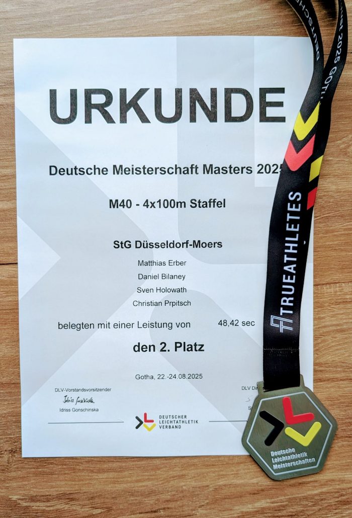 Auf den Deutschen Seinioren Meisterschaften , neudeutsch „Masters DM“ , in Gotha vom 22. bis 26. August 2025 liefen die ASC-ler Mathias Erber , Daniel Bilaney unterstütz durch Sven Holowath und Christian Prpitsch vom Moerser TV , die 4x 100m Staffel der Altersklasse M40. Christian trug als Schlußläufer , der STG Düsseldorf Moers , den Staffelstab , in neuer Bestzeit von 48,42 sec , hinter der Siegerstaffel der STG Emscher Werre Express , als Zweiter über die Ziellinie. Knapp 3 Stunden zuvor lief Mathias Erber , über 100m der M40 , und gewann seinem Zeitendlauf in persönlicher neuer Bestzeit von 12,07 sec und errang damit Platz 8 in der Gesamtwertung. Bemerkenswert ist das Ergebnis , da dies erst sein 2-ter Einzel-Wettkampf im Trikot des ASC war.