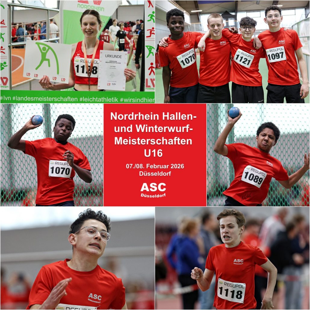 Am 07./08. Februar kamen die besten Athlet*innen des Landesverbands Nordrhein zum Hallensaisonhighlight in die Leichtathletikhalle des Düsseldorfer Sportparks zu den Nordrhein Hallen- und Winterwurfmeisterschaften U14/U16. Mit 62 Jugendlichen stellte der ASC Düsseldorf das zweitgrößte Teilnehmerfeld. In der U16 gingen 37 Athlet*innen an den Start. Sie gewannen eine Silber- und fünf Bronzemedaillen und erreichten 21-mal die Top-8. Mit sechs 4. Plätzen und sechs 9. Plätzen hätte das Ergebnis dabei noch besser ausfallen können.